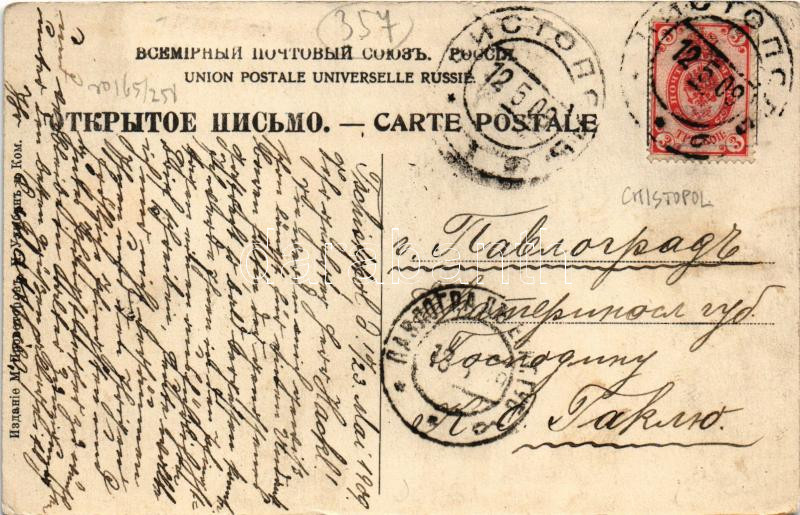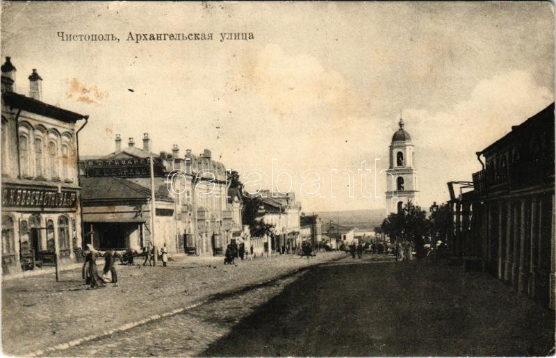 1909 Chistopol, street view, shops, church (wet damage) https://www.darabanth.com/de/45-Gross-Auktion/45.1/Ansichtskarten/RuC39Fland~18810/1909-Chistopol-street-view-shops-church-wet-damage~II3453802