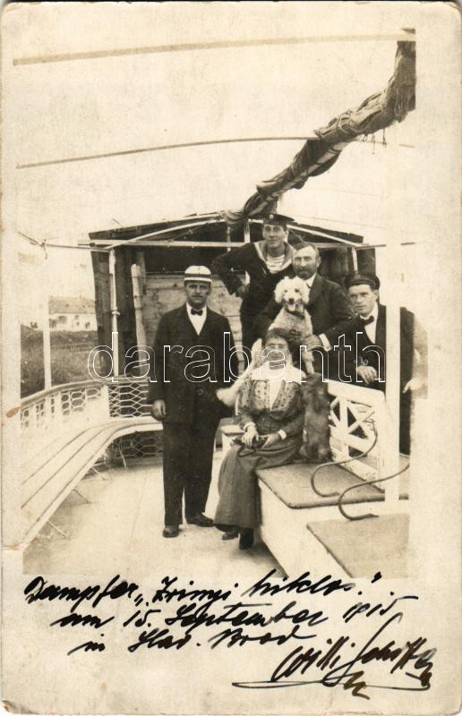 1915 Dampfer Zrínyi Miklós / ZRÍNYI MIKLÓS gőzhajó, fedélzet matrózzal és kutyákkal. Az első világháborúban SM Spitalschiff ZRÍNYI MIKLÓS kórházhajó a Dunaflottillában / ZRÍNYI MIKLÓS steamship, sailor and dogs on board. During the First World War, she served as a hospital ship for the K.u.K. Kriegsmarine Danube Fleet (Donauflottille). photo (kopott sarkak / worn corners)