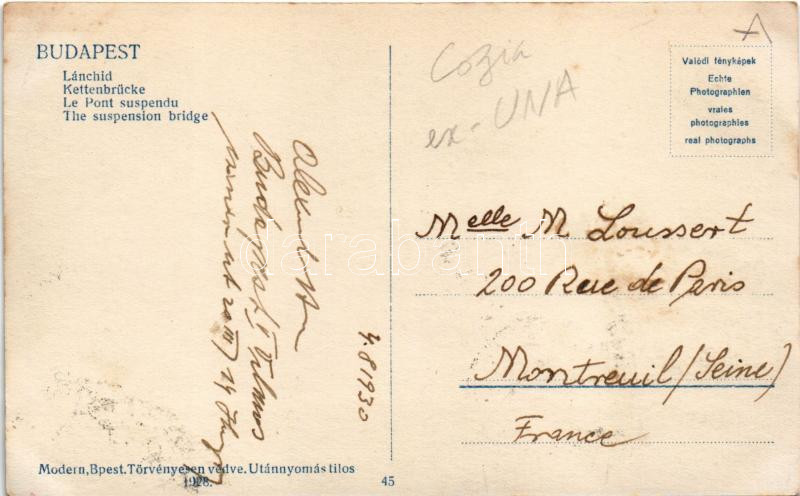 1930 Budapest, Lánchíd. COZIA román gőzhajó (Az első világháborúban SMS UNA felfegyverzett gőzös. Dunaflottilla) / Romanian steamship COZIA (ex SMS UNA). During the First World War, she was an armed steamer in the Austro-Hungarian Navy Danube Fleet (EK)