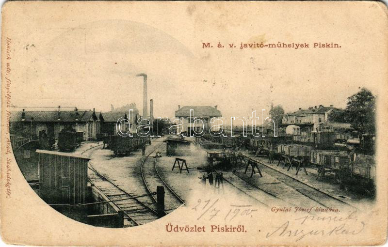 1900 Piski, Simeria; MÁV javítóműhelye vonatokkal, vasútállomás. Gyulai József kiadása. Honisch udvari fényképész felvétele / repair workshop of the Hungarian State Railways with trains, railway station (EB)