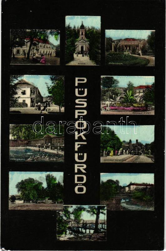 1912 Püspökfürdő, Szentlászlófürdő, Baile 1 Mai (Nagyvárad, Oradea); mozaiklap vasútállomással / multi-view postcard with railway station (kis szakadás / small tear)