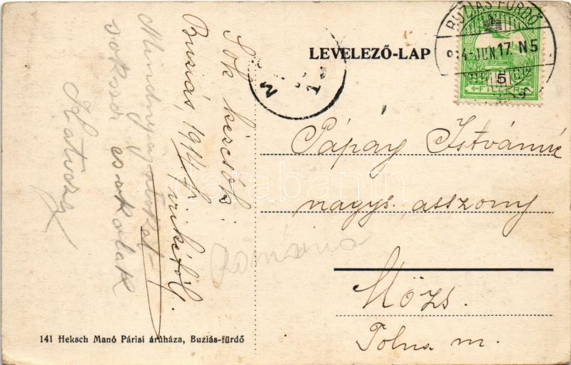 1914 Buziásfürdő, Baile Buzias; Eusch villa. Heksch Manó kiadása / vil... https://www.darabanth.com/de/45-Gross-Auktion/45.1/Ansichtskarten/Siebenburgen~18764/1914-Buziasfurdo-Baile-Buzias-Eusch-villa-Heksch-Mano-kiadasa-villa-kopott-sarkak-worn-~II3435300
