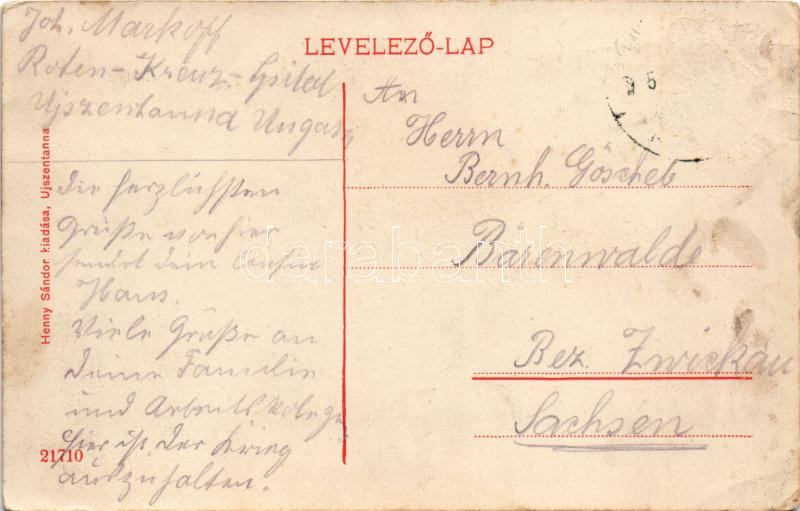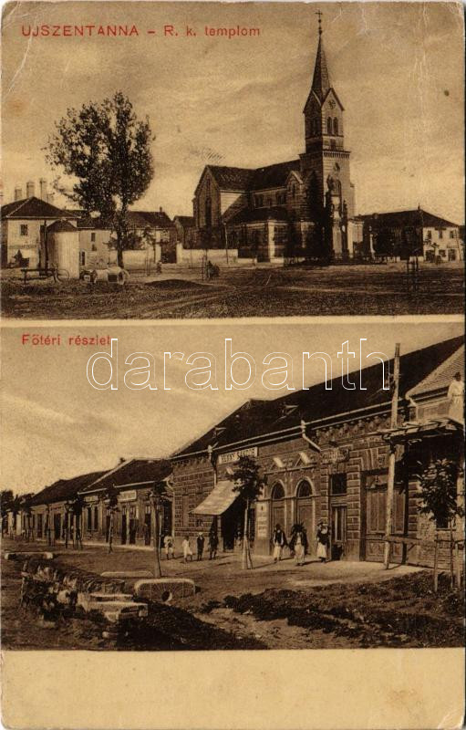 1915 Újszentanna, Új-Szt.-Anna, Szentanna, Santana; Római katolikus templom, Fő tér, Henny Sándor és Frank Ferenc üzlete. Henny Sándor saját kiadása / church, main square, shops (Rb)