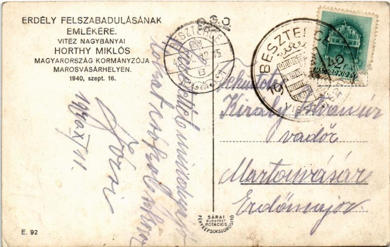 Beschreibung: 1940 Marosvásárhely, Targu Mures; bevonulás, vitéz Nagybányai Horthy Miklós kormányzó / entry of the Hungarian troops, Regent Horthy + "1940 Beszterce visszatért" So. Stpl. (EB)