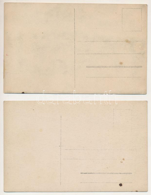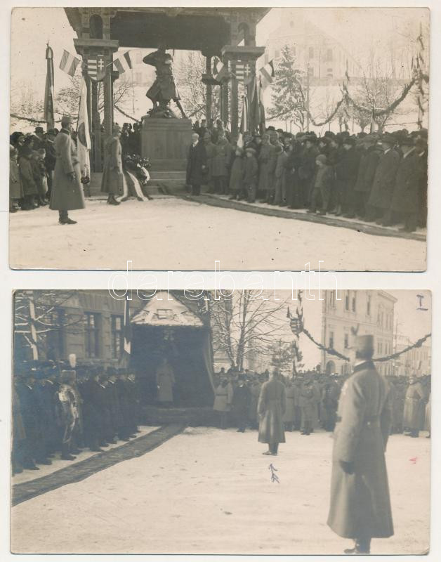 Székelyudvarhely, Odorheiu Secuiesc; Vasszékely szobor avatási ünnepsége magyar címerrel és zászlókkal (1919 februárjában a románok ledöntötték) / inauguration ceremony of the military monument, Hungarian coat of arms and flags (demolished by the Romanians in 1919) - 2 db RÉGI fotó képeslap / 2 pre-1945 photo postcards