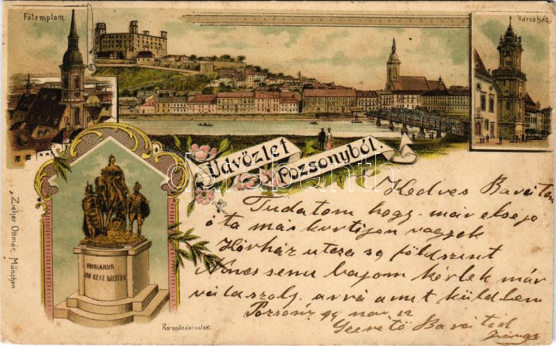 1899 Pozsony, Pressburg, Bratislava; Főtemplom, vár, Városháza, Koronázási emlék (Mária Terézia szobor) / church, castle, town hall, monument. Ottmar Zieher Art Nouveau, floral, litho (r)