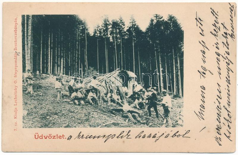 1899 Szliács, Sliac (?); favágók. Lechnitzky O. kiadása (Besztercebány... https://www.darabanth.com/de/45-Gross-Auktion/45.1/Ansichtskarten/Slowakei~18765/1899-Szliacs-Sliac-favagok-Lechnitzky-O-kiadasa-Besztercebanya-lumberjacks-gyuro~II3418864
