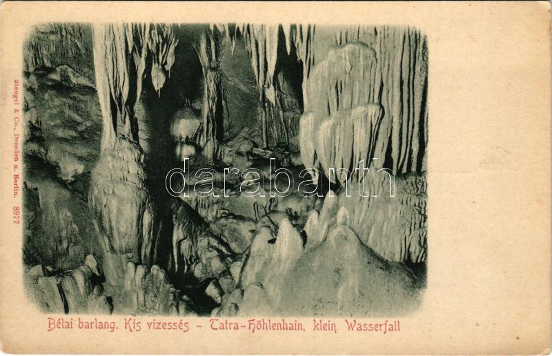 Beschreibung: 1902 Barlangliget, Höhlenhain, Tatranská Kotlina (Magas-Tátra, Vysoké Tatry); Bélai-cseppkőbarlang, kis vízesés, belső. Stengel & Co. (Dresden) kiadása / Höhlenhain, klein. Wasserfall / Belianska Cave interior (EK)