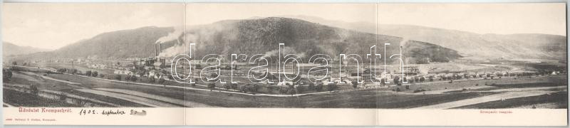 Beschreibung: 1902 Korompa, Krompach, Krompachy (Szepes); vasgyár. Balkányi S. kiadása, 3-részes kihajtható panorámalap / ironworks, iron factory. 3-tiled folding panoramacard