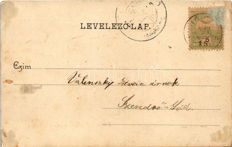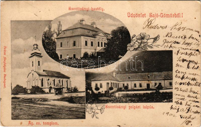 1902 Sajógömör, Sajó-Gömör, Gemer; Szentiványi kastély és polgári iskola, Evangélikus templom. Sréter fényképész / castle, school, Lutheran church. Art Nouveau, floral (ragasztónyom / glue marks)