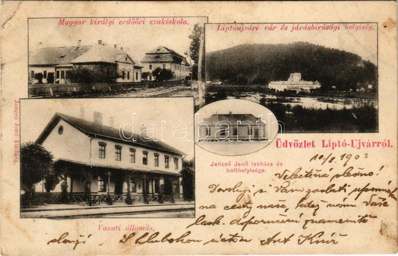 1903 Liptóújvár, Liptovsky Hrádok; M. kir. erdőőri szakiskola, vár és járásbíróság, vasútállomás, Jancsó Jenő lakháza és üzlete. Jancsó Jenő saját kiadása / forestry school, castle and district court, railway station, publisher's shop and house (EK)