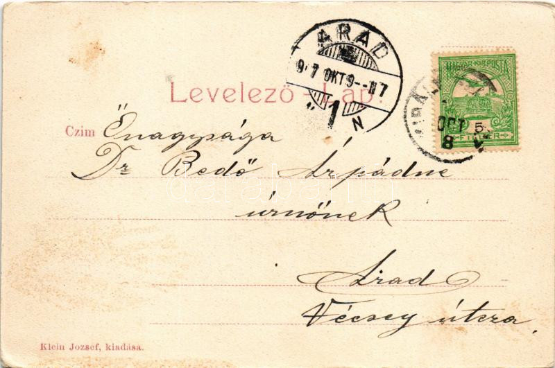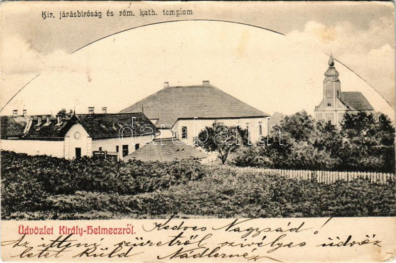 1907 Királyhelmec, Helmec, Kralovsky Chlumec; Kir. Járásbíróság és Római katolikus templom. Klein József kiadása / district court, Catholic church (kopott sarkak / worn corners)