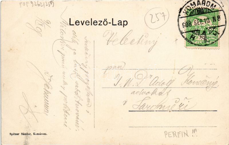Beschreibung: 1908 Komárom, Komárno; Lenfonógyár. Spitzer Sándor kiadása / flax spinning mill, factory + perfin (EK)