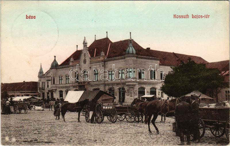 Beschreibung: 1908 Léva, Levice; Kossuth Lajos tér, Városháza, Popper Győző üzlete, piac / square, shops (EK)
