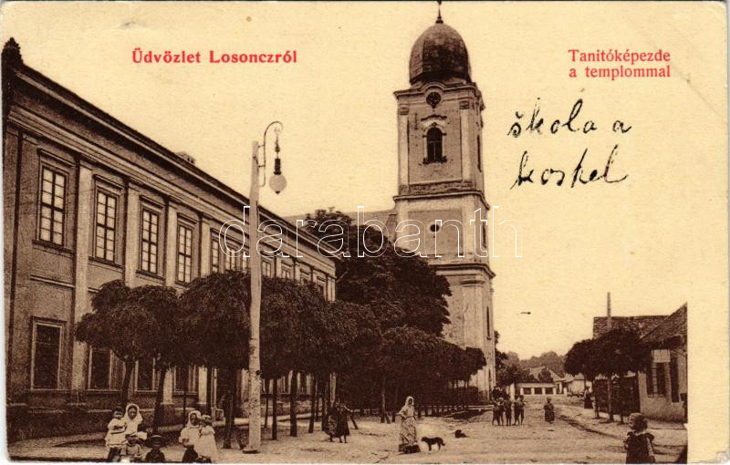 Beschreibung: 1908 Losonc, Lucenec; Tanítóképezde a templommal. Roth Simon kiadása / teachers' training institute, church (EK)