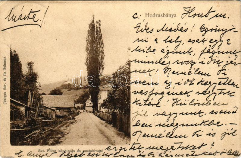 1910 Hodrusbánya, Banská Hodrusa (Hodrushámor, Hodrusa-Hámre); Szent Péter kápolna és a postahivatal. Joerges özvegye és fia kiadása / chapel, post office (EK)