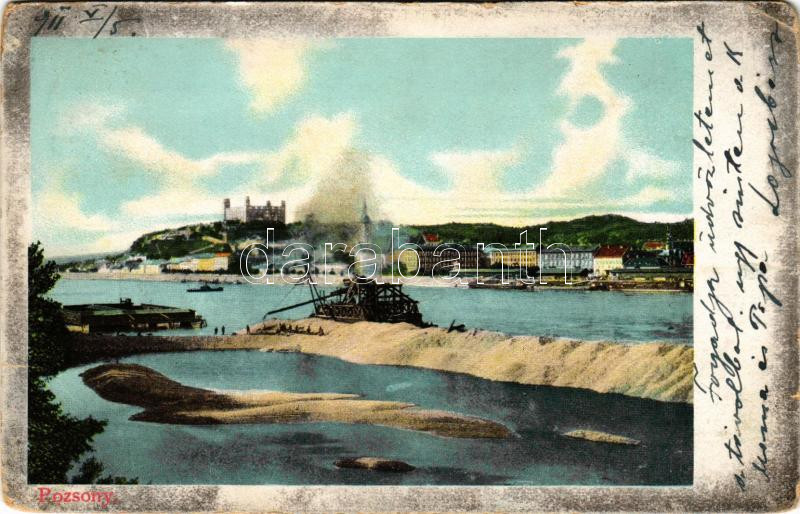 Beschreibung: 1911 Pozsony, Pressburg, Bratislava; látkép a várral, előtérben kotróhajó, uszoda / general view with castle and dredge, swimming pool (EM)