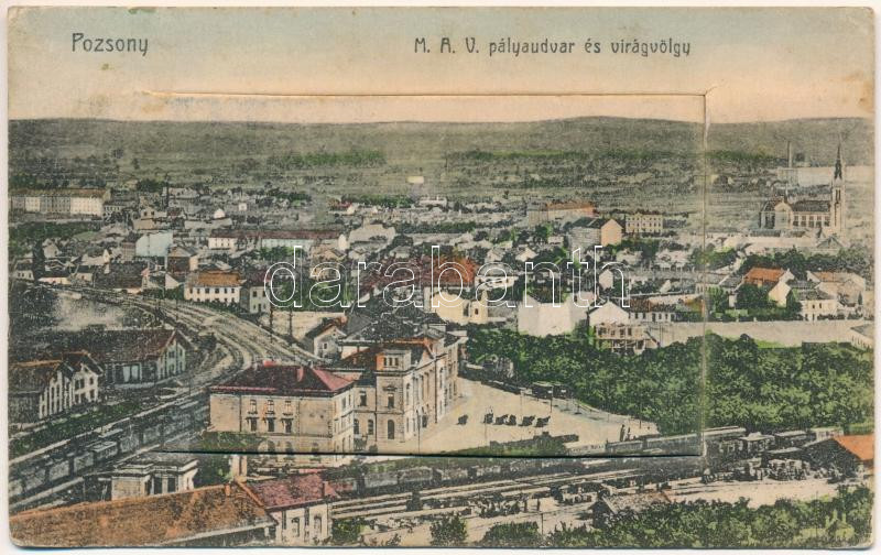 1912 Pozsony, Pressburg, Bratislava; MÁV pályaudvar és Virágvölgy, vasútállomás. leporellólap 10 képpel / railway station and Blumenthal. leporellocard with 10 pictures (EK)