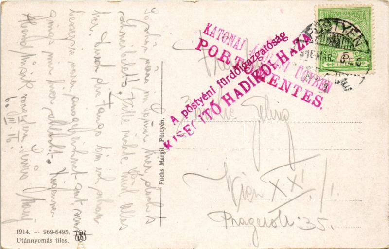 Beschreibung: 1916 Pöstyén, Piestany; Bankára vezető híd. Fuchs Margit kiadása / Brücke nach Banka / bridge to Banka + "A pöstyéni fürdőigazgatóság kisegítő hadikórháza" "Katonai ápolási ügyben portómentes" (EK)