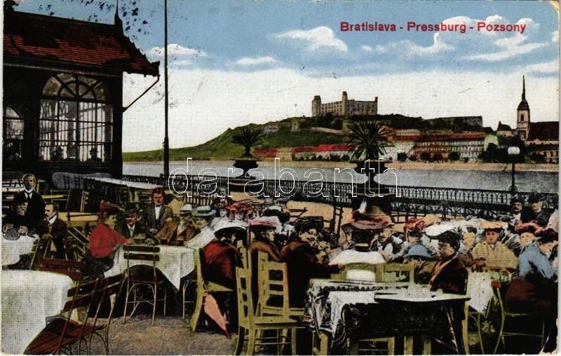 1934 Pozsony, Pressburg, Bratislava; Ligeti kávéház, terasz vendégekkel és pincérekkel, háttérben a vár / café terrace with guests and waiters, castle in the background (kopott sarkak / worn corners)