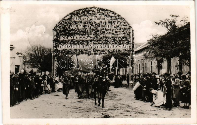 1938 Párkány, Stúrovo; bevonulás, "Éljen Horthy! Mindent vissza! Győzött Magyarország!" díszkapu, magyar zászló / entry of the Hungarian troops, decorated gate, Hungarian flag (fl)