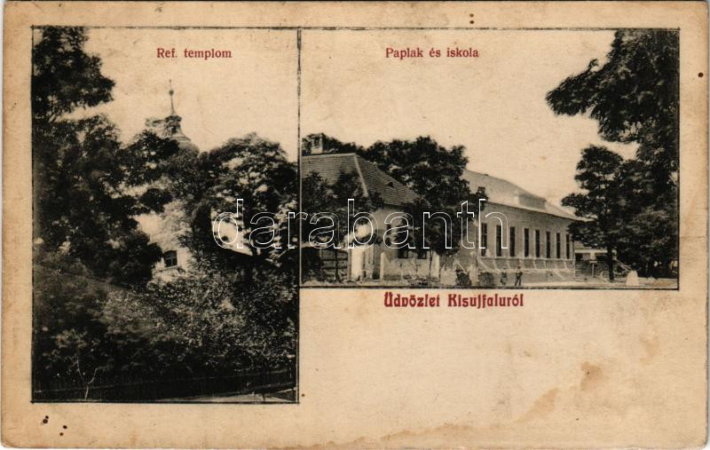 Beschreibung: Kisújfalu, Nová Vieska; Református templom, Paplak és iskola / Calvinist church, parish and school (r)