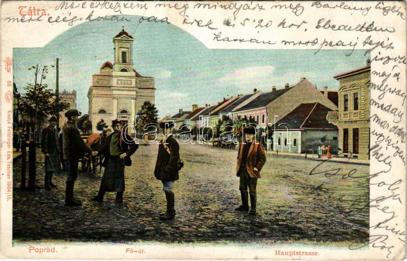 Beschreibung: Poprád (Tátra, Magas-Tátra, Vysoké Tatry); Fő út, templom, üzletek. Feitzinger Ede 65. Auto-Chrom 1904/15. / Hauptstrasse / main street, church, shops (EB)