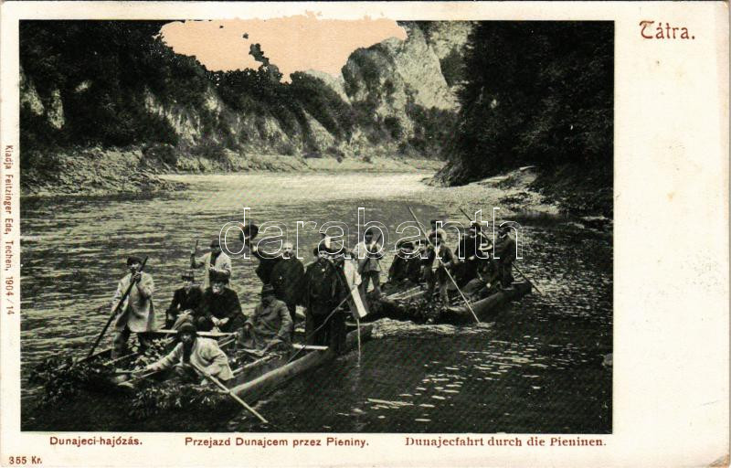Tátra, Magas Tátra, Vysoké Tatry; Dunajeci hajózás, tutajok magyar zászlókkal. Feitzinger Ede Nr. 355. Kr. 1904/14. / Przejazd Dunajcem przez Pieniny / Dunajecfahrt durch die Pieninen / rafting with Hungarian flags (felületi sérülés / surface damage)