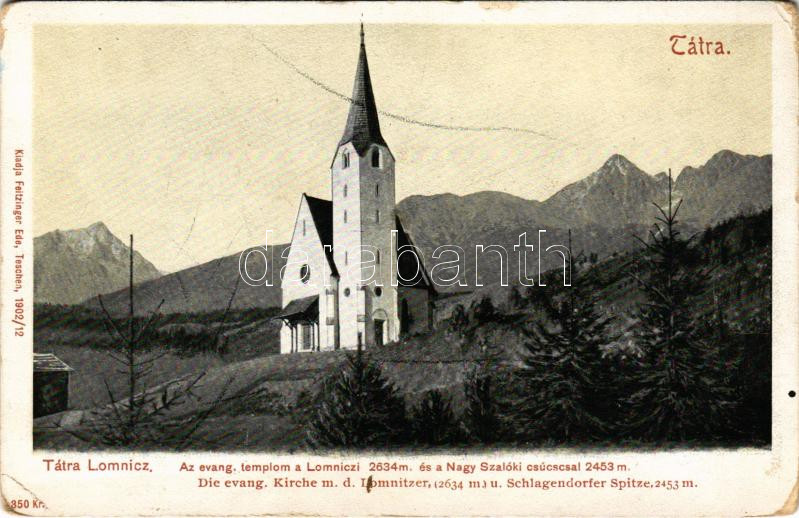 Tátralomnic, Tatranská Lomnica (Magas-Tátra, Vysoké Tatry); Die evang. Kirche m. d. Lomnitzer und Schlagendorfer Spitze / evangélikus templom a Lomnici és Nagy-Szalóki csúccsal. Feitzinger Ede 1902/12. 350. / churches, Lomnicky stít (kopott sarkak / worn corners)
