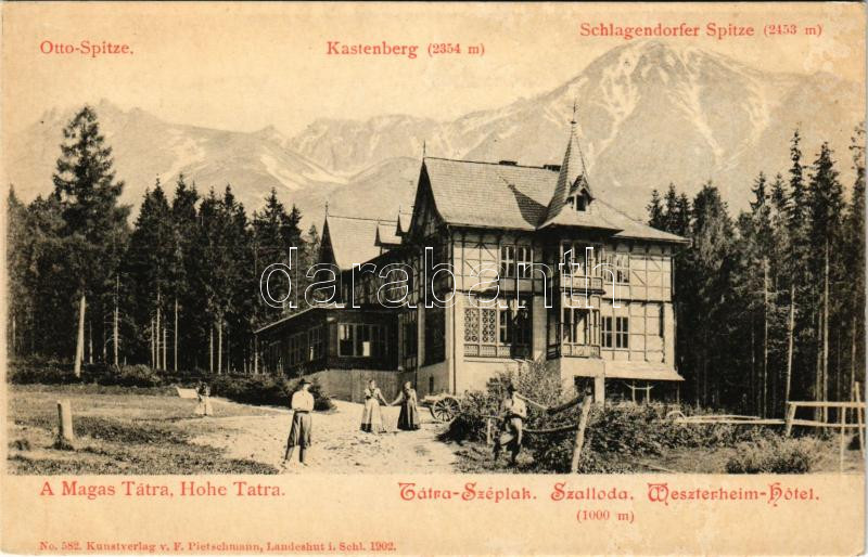 Tátraszéplak, Tatranska Polianka, Westerheim (Magas Tátra, Vysoké Tatry); Széplak szálloda, hegycsúcsok. F. Pietschmann No. 582. / Weszterheim-Hotel, Otto-Spitze, Kastenberg, Schlagendorfer Spitze / hotel, villa, mountain peaks (fl)