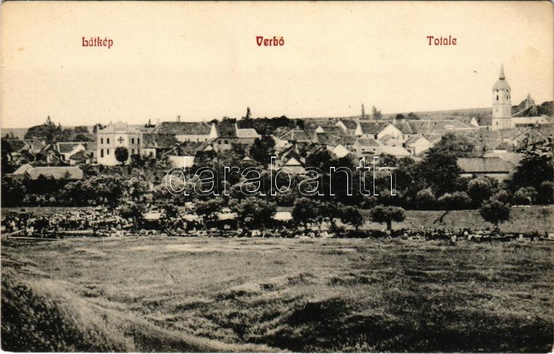 Beschreibung: Verbó, Vrbové; Totale / látkép a zsinagógával. Emanuel István kiadása / general view with synagogue (EK)