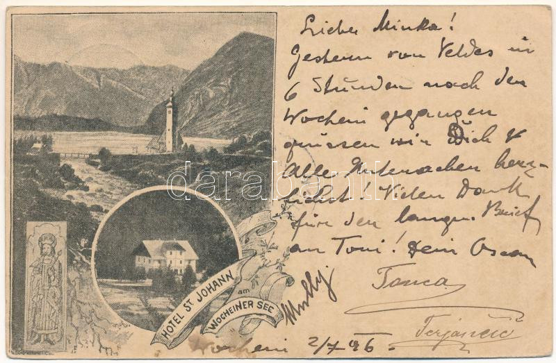 Beschreibung: 1896 (Vorläufer!!!) Sveti Janez, Sankt Johann am Wocheinersee (Bohinj); Hotel St. Johann am Wocheiner See / hotel, church. Art Nouveau, floral (EK)