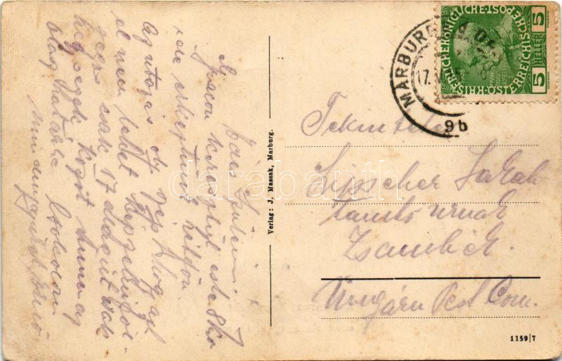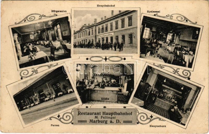 1915 Maribor, Marburg; Restaurant Hauptbahnhof M. Fellinger. Hauptbahnhof, Bürgersalon, Speisesaal, Perron, Küche, Hauptschank. Verlag J. Massak / central railway station restaurant, interiors with waiters, kitchen with workers. Art Nouveau frame (fl)