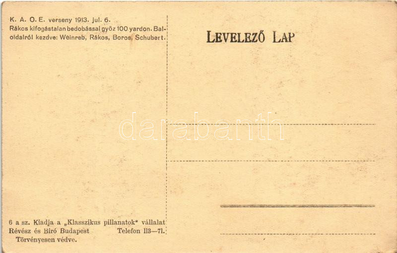 1913 július 6. K.A.O.E. verseny: Rákos kifogástalan bedobással győz 100 yardon: Weinreb, Rákos, Boros, Schubert. Klasszikus pillanatok vállalat 6a sz. Révész és Biró műterem / Hungarian running race, sport (EK)