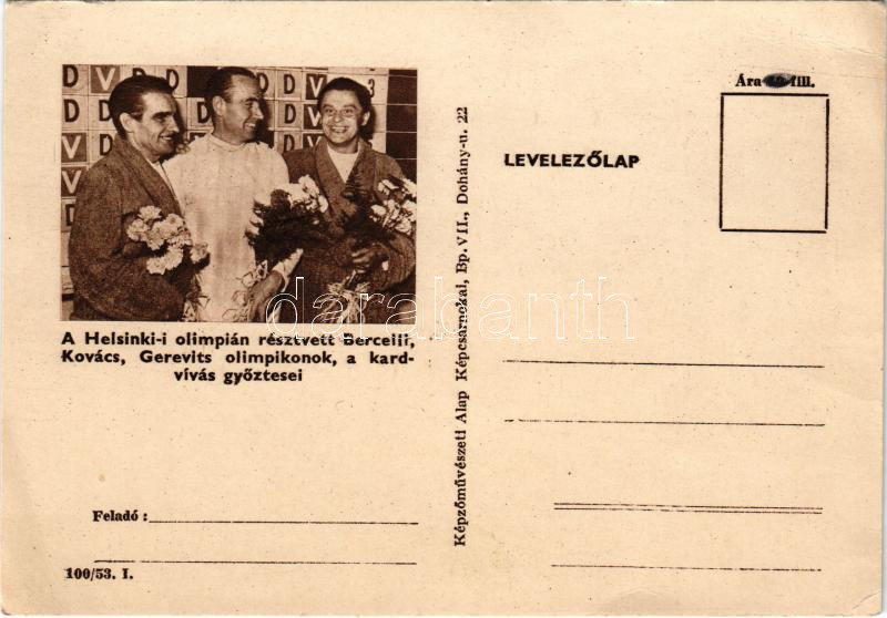 1953 A Helsinki-i olimpián részt vett Bercelli, Kovács Gerevits olimpikonok, a kardvívás egyéni és csoport győztesei. Képzőművészeti Alap Kiadóvállalat / Hungarian socialist-communist sport propaganda: winners of the Helsinki Olympics in fencing (non PC) (EB)