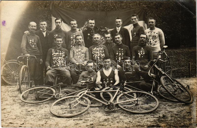 Férfiak kerékpárral, kitüntetésekkel, csoportkép / Men with bicycles a... https://www.darabanth.com/de/45-Gross-Auktion/45.1/Ansichtskarten/Sport~18850/Ferfiak-kerekparral-kituntetesekkel-csoportkep-Men-with-bicycles-and-medals-group-picture~II3444303