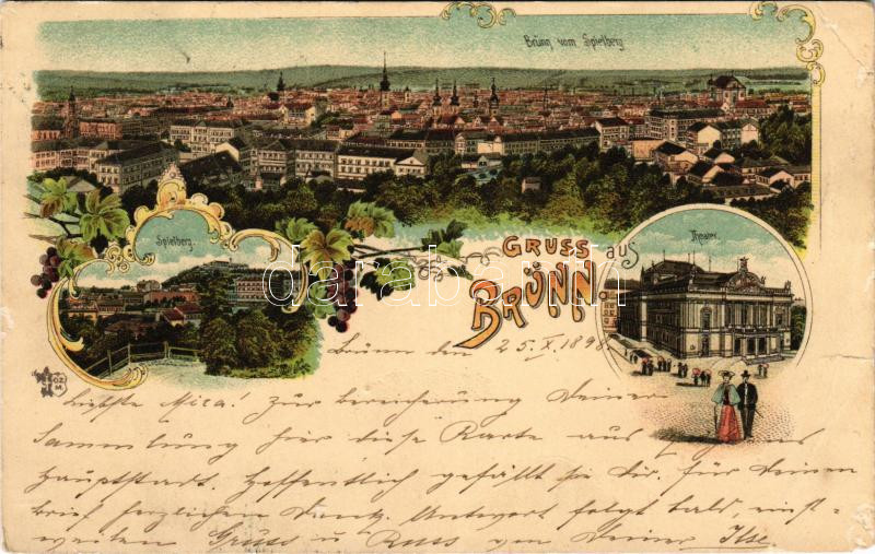 1898 (Vorläufer) Brno, Brünn; Theater, Spielberg / theatre, Spilberk c... https://www.darabanth.com/de/45-Gross-Auktion/45.1/Ansichtskarten/Tschechische-Republik~18778/1898-Vorlaufer-Brno-Brunn-Theater-Spielberg-theatre-Spilberk-castle-OZM-Art-Nouveau-f~II3413333