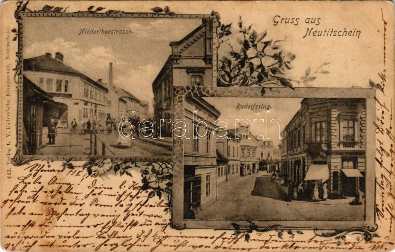 Beschreibung: 1900 Novy Jicín, Neutitschein; Niederthorstrasse, Rudolfsring. L. V. Enders'sche Kunstanstalt / street, shops. Art Nouveau, floral (EB)