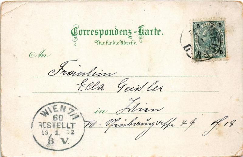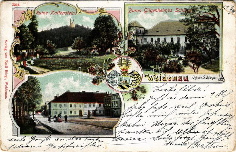 1902 Vidnava, Weidenau; Ruine Kaltenstein, Baron Gilgenheimbs Schloss / castle ruins, castle, square with shops. Verlag von Emil Bürgl. Art Nouveau, floral with coat of arms (EB)
