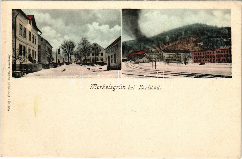 Merklín u Karlovych Var, Merkelsgrün bei Karlsbad (Karlovy Vary); stre... https://www.darabanth.com/de/45-Gross-Auktion/45.1/Ansichtskarten/Tschechische-Republik~18778/Merklin-u-Karlovych-Var-Merkelsgrun-bei-Karlsbad-Karlovy-Vary-street-view-factory-in-winter-~II3413309