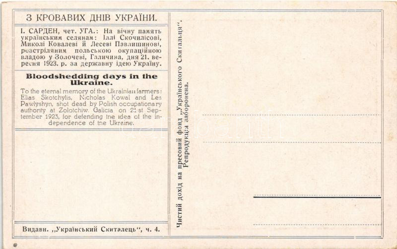 Bloodshedding days in Ukraine. To the eternal memory of the Ukrainian farmers: Elias Skotchylis, Nicholas Kowal and Les Pawlyshyn, shot dead by Polish occupationary authority at Zolotchiw (Zolochiv), Galicia on 21st September 1923, for defending the idea of the independence of Ukraine (EK)