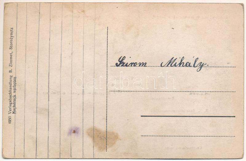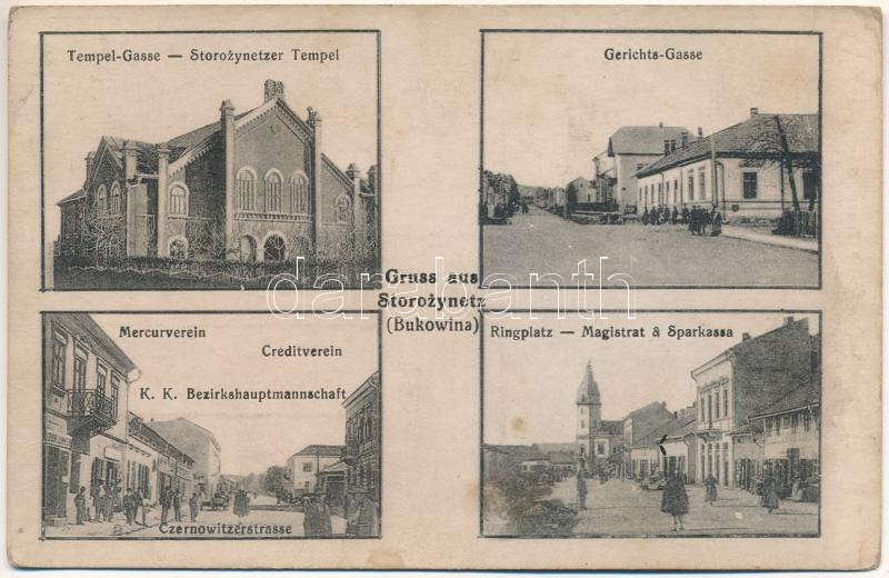 Storozhynets, Storojinet, Storoschynez, Storozyniec, Storozynetz (Bukovina, Bucovina, Bukowina); Tempel-Gasse, Storozynetzer Isr. Tempel, Gerichts-Gasse, Mercurverein, Creditverein, Czernowitzerstrasse, K.K. Bezirkshauptmannschaft, Ringplatz, Magistrat & Sparkassa. Verlag B. Zimmet / zsinagóga, utcák, hitelintézet, piactér, városháza és takarékpénztár / synagogue, streets, K.u.K. district administration, market square, town hall, savings bank (r)