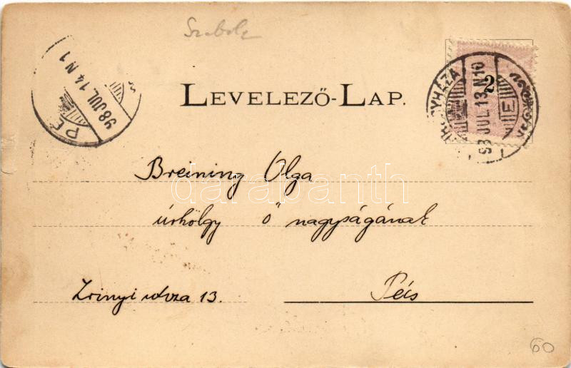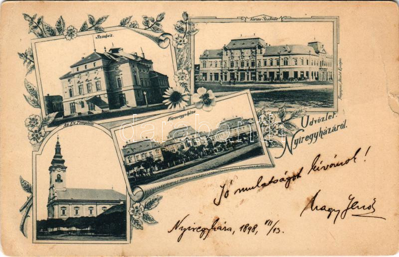 Beschreibung: 1898 Nyíregyháza, Színház, Korona szálloda, Vármegyeháza, Evangélikus templom. Art Nouveau, floral (szakadás / tear)