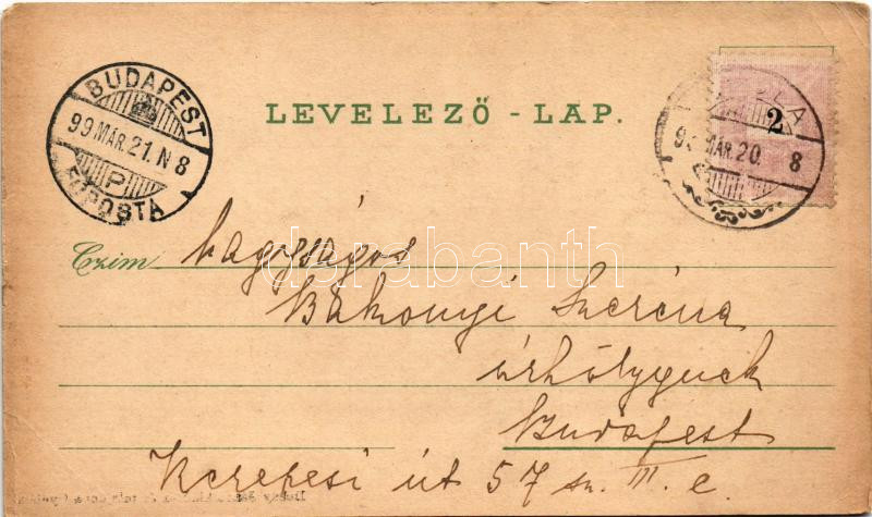 1899 Gyula, Megyeháza, Göndöcs kerti pavilon, Római katolikus templom, Gróf Wenckheim kastély, Óvár, Törvényszéki palota, múzeum, Erkel Ferenc szobra, Gyulai Cognac gyár és törkölyfőzde. Dobay János kiadása és tulajdona. Art Nouveau, floral, litho (EM)