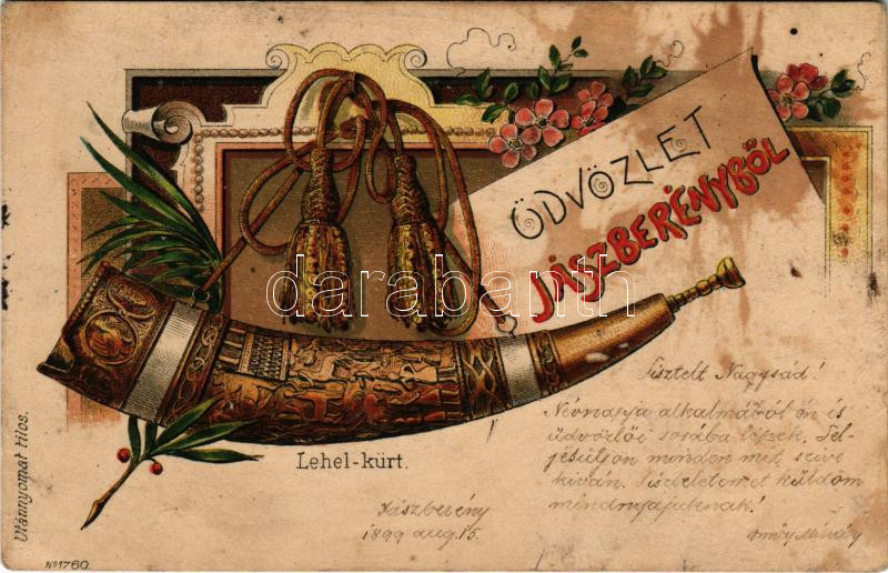 1899 Jászberény, Lehel-kürt, floral, Art Nouveau, litho (lyuk / pinhol... https://www.darabanth.com/de/45-Gross-Auktion/45.1/Ansichtskarten/Ungarn~18763/1899-Jaszbereny-Lehel-kurt-floral-Art-Nouveau-litho-lyuk-pinhole~II3437805