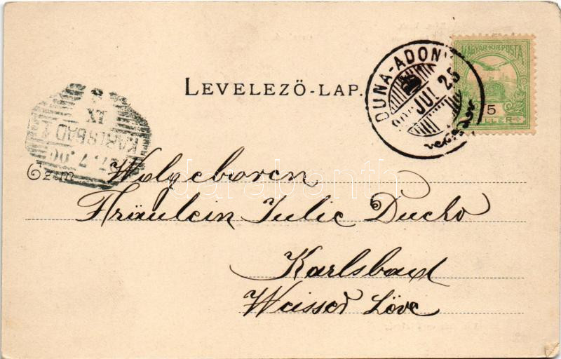 Beschreibung: 1900 Adony, Duna-Adony; Római katolikus templom, Országút, Városháza és tűzőrség, tűzoltószertár, Pável István üzlete és saját kiadása (EM)