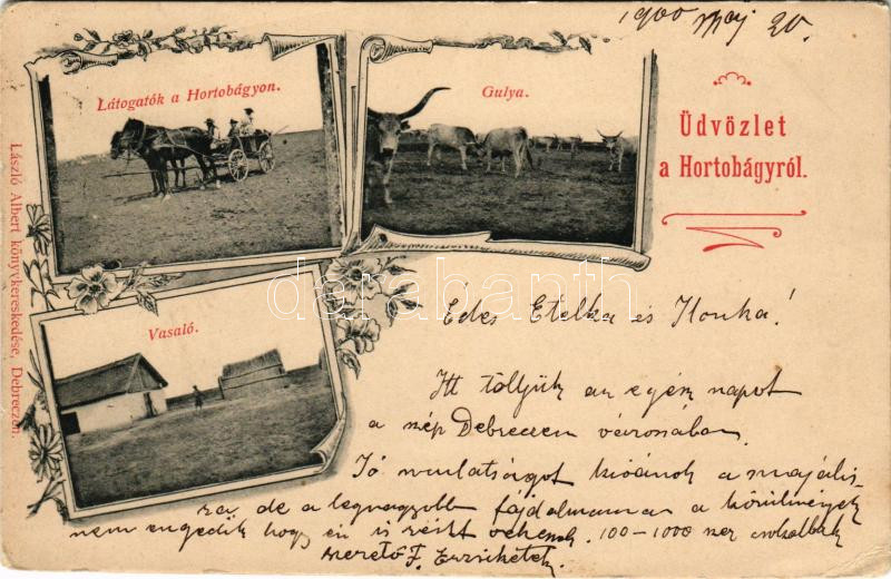 Beschreibung: 1900 Hortobágy, Látogatók a Hortobágyon, gulya, vasaló. László Albert kiadása, szecessziós-virágos keret. Art Nouveau, floral (Rb)
