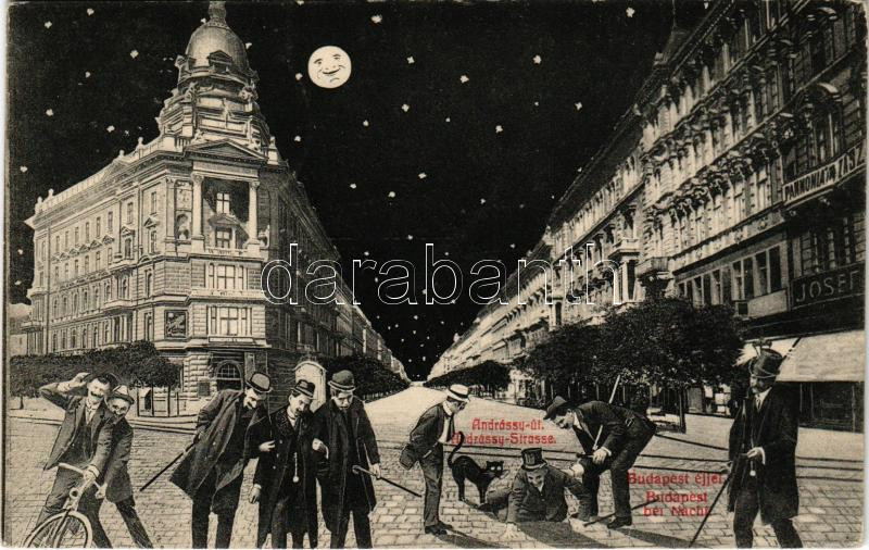 1909 Budapest VI. Andrássy út éjjel, humoros részeg montázs, macska, ü... https://www.darabanth.com/de/45-Gross-Auktion/45.1/Ansichtskarten/Ungarn~18763/1909-Budapest-VI-Andrassy-ut-ejjel-humoros-reszeg-montazs-macska-uzlet-EK~II3420880
