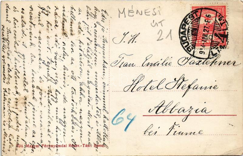 1914 Budapest XI. Saxlehner-villa. A képeslap címzettje a villa tulajdonosa, Saxlehner Andrásné Pelikán Emília (1835-1924), a Budai Keserűvíz felfedezőjének felesége, keserűvízgyáros, feladója a gyermekei, Kálmán és Emília. Ménesi út 21. (EB)