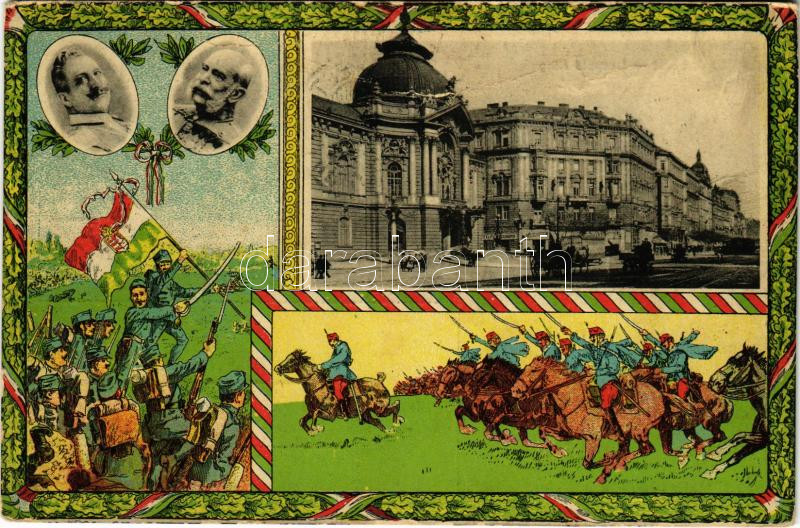 1916 Budapest XIII. Lipót körút, Vígszínház, mozi. Magyar zászlós hazafias keret II. Vilmos császárral, Ferenc Józseffel és katonákkal. Art Nouveau (fa)
